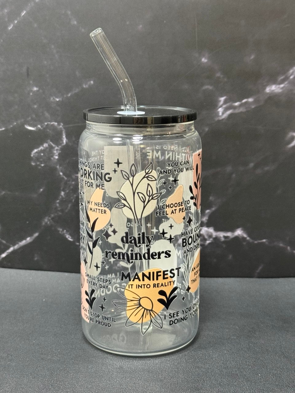16oz Glass Cup. This glass cup features a permanent UV DTF wrap design. Comes with a plastic lid, a reusable clear glass straw and a plastic one.